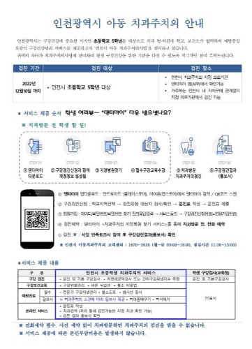 김석철 시 건강보건국장은 "치아는 한번 망가지면 재생이 불가하므로 올바른 구강 관리를 통한 질병 예방이 무엇보다 중요하다"며 "비용 부담 없는 전문적인 구강 관리 서비스에 인천시 초등학교 5학년 학생들의 많은 참여를 부탁한다"고 말했다.