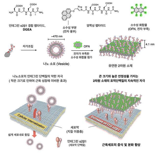 또한 수 마이크로미터의 크기를 가지는 펩타이드 신물질의 2차원 구조는 세포 내부로 쉽게 함입을 일으키지 않고, 세포막 단백질인 인테그린과 지속적인 상호작용을 통해 근육 세포의 증식과 분화를 촉진했다.