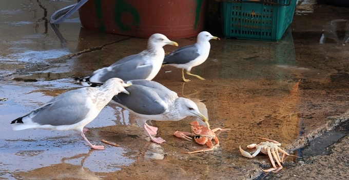 귀하디 귀한 울진대게, 울진에서는 갈매기도~ 대게를 먹는다... 울진 대게 위판이 끝난 경북 울진군 후포항.