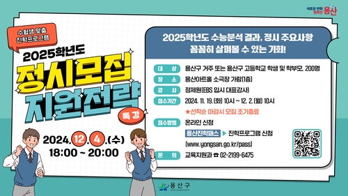 서울 용산구(구청장 박희영)가 대학수학능력시험 성적 통지(12월 6일) 전후로 수험생 맞춤 진학프로그램을 운영해 지역 내 수험생의 정시모집 합격을 지원한다고 밝혔다.
