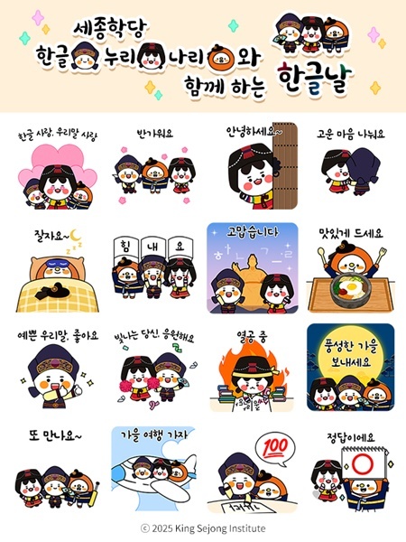 세종학당재단은 오는 10월 9일부터 카카오톡을 통해 휴대전화 그림말(이모티콘) 16종을 선착순 2만 5천 명에게 무료 배포한다. 그림말은 세종학당의 상징물(캐릭터) ‘한글·누리·나리’를 활용해 생활 속 우리말 사용을 권장하고 한국어 학습자인 외국인을 응원하는 문구로 구성돼 있다. 그림말은 카카오톡 앱에서 ‘2025 세종학당’을 검색해 공식 계정에서 내려받을 수 있으며, 한 달간 자유롭게 사용할 수 있다.