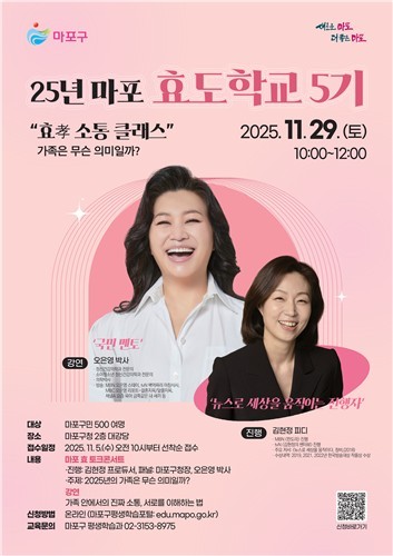 '마포 효도학교 5기'로 진행되는 '효(孝) 소통 클래스'는 가족의 의미를 재조명하고 세대 간 마음을 잇는 따뜻한 소통의 장으로, 11월 29일 오전 10시 마포구청 대강당에서 열린다.