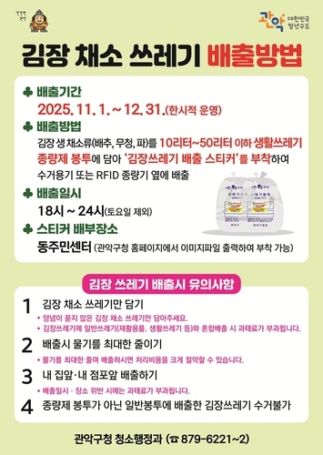 【국제일보】 서울 관악구(구청장 박준희)는 김장철을 맞아 대량으로 발생하는 채소류 쓰레기로 인한 주민 불편을 해소하고 쾌적한 생활환경을 조성하기 위해 11월 1일부터 12월 31일까지 '김장철 채소쓰레기 특별처리 기간'을 운영한다.