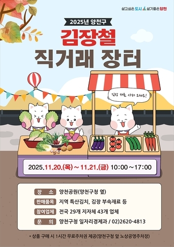 한편, 이번 장터 참여업체들은 판매수익금의 5% 이내를 양천사랑복지재단에 자발적으로 기부해 관내 어려운 이웃을 도울 예정이다. 구는 김장철 직거래 장터뿐만 아니라 설·추석 직거래 장터 등 행사마다 자율적 기부를 이어오며 따뜻한 장터 기부문화를 정착시키고 있다.