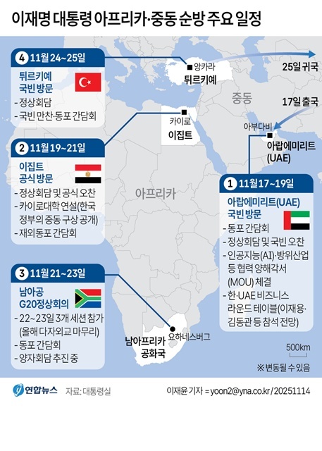 경주 아시아태평양경제협력체(APEC) 정상회의가 종료된 지 16일만에 다시 다자 정상회의 참석을 위해 출국하는 것이다. UAE·이집트·남아공·튀르키예를 차례로 방문하는 7박10일 일정이다.