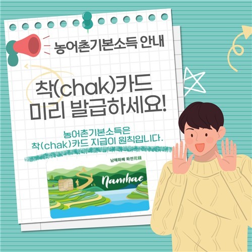 남해군은 고령자와 디지털 취약계층을 대상으로 민원창구 상담, 안내자료 배부 등 맞춤형 지원을 병행할 예정이며, 이장회의와 마을방송, 게시판 등을 통해 착카드 가입 필요성과 발급 절차를 지속적으로 안내할 예정이다.
