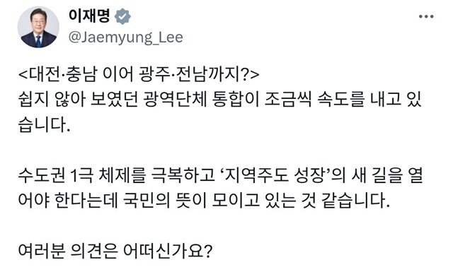 이 대통령은 이날 엑스(X·옛 트위터)에 '대전·충남에 이어 광주·전남까지?'라는 제목의 글을 올리며 이같이 밝혔다.