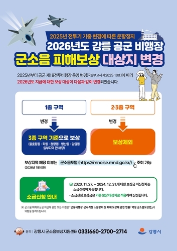변경된 보상대상지는 군소음 포털(https://mnoise.mnd.go.kr/)에서 1월 중순에 확인할 수 있으며, 자세한 변경사항에 대한 문의나 접수 안내는 강릉시군소음보상지원센터(033-660-2700∼2714)로 전화하면 된다.