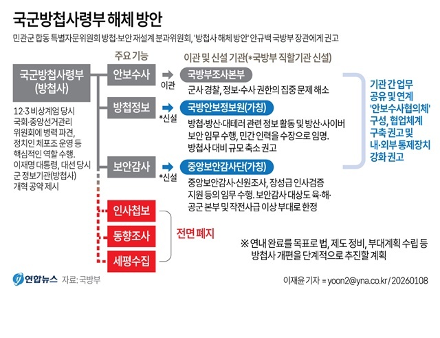 ![[그래픽] '민관군 합동 특별자문위원회 방첩·보안 재설계 분과위원회'는 방첩사 해체 방안을 안규백 국방부 장관에게 권고했다고 8일 밝혔다. 이에 따라 국군방첩사령부가 해체되고 방첩사의 안보수사 기능은 군사경찰인 국방부조사본부로, 방첩정보와 보안감사 기능은 신설되는 국방부 직할기관인 국방안보정보원(가칭)과 중앙보안감사단(가칭)로 각각 이관되며, 인사첩보 및 동향조사 등의 기능은 폐지된다. / 연합뉴스](http://www.kookjeilbo.com/data/photos/20260102/art_17678547686041_0ba276.jpg)