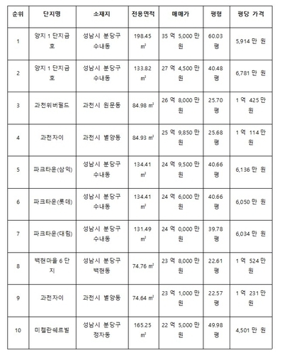 매매가격 1위는 분당구 수내동 양지1단지금호 198.45㎡로 35억5천만원을 기록했고, 평당 가격은 5천914만원으로 조사됐다.