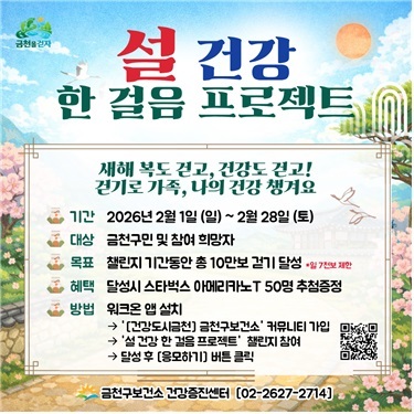 금천구는 일상 속 걷기 실천을 통해 지역주민들의 신체활동을 유도하고 건강한 생활습관 형성을 돕기 위해 '설 건강 한 걸음 프로젝트'와 '노담 노술 라이프 건강걷기' 챌린지를 운영한다고 밝혔다.