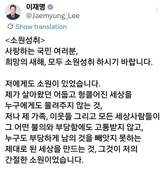 이 대통령은 설날인 이날 엑스(X·옛 트위터) 계정에 글을 올려 "사랑하는 국민 여러분, 새해에 모두 소원성취하기를 바란다. 저에게도 소원이 있었다"며 이같이 남겼다.