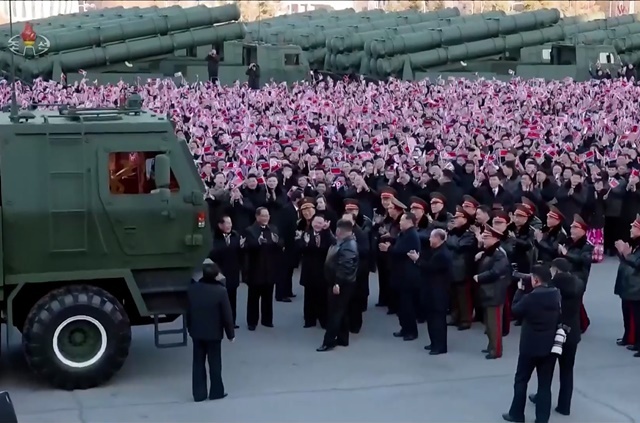 (서울=연합뉴스) 제9차 당대회를 앞둔 북한이 남한 전역을 사정권에 둔 신형 600㎜ 대구경 방사포 전달행사를 가졌다.