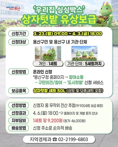 【국제일보】 서울 용산구(구청장 박희영)가 아파트 베란다와 주택 마당 등 생활공간에서 손쉽게 작물을 키울 수 있는 '상자텃밭' 보급에 나선다. 소소한 수확의 즐거움과 함께 도시농업을 일상으로 확산하겠다는 취지다.
