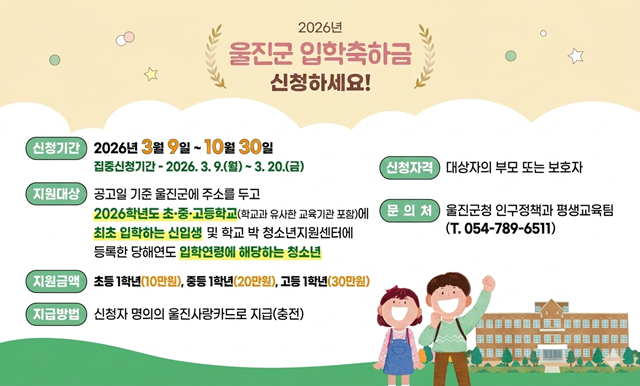 한편 입학축하금 지원과 관련한 자세한 사항은 주소지 읍·면 사무소 또는 울진군청 인구정책과 평생교육팀(☎054-789-6511)으로 문의하면 된다.