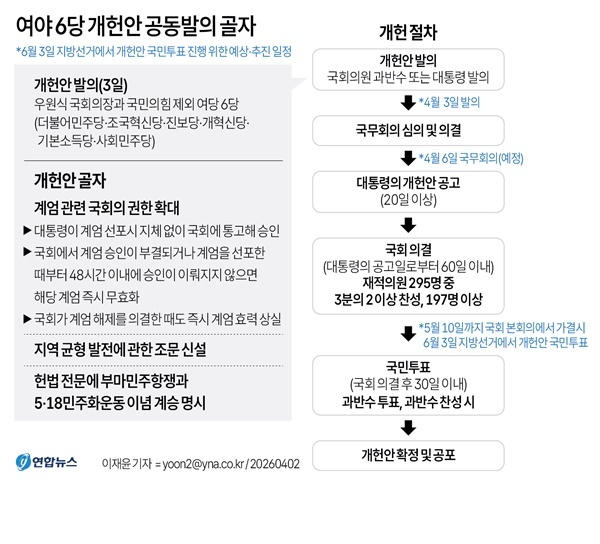 지선에서의 개헌 국민투표에 드라이브를 걸고 있는 우원식 국회의장은 이날 개헌안 제출 전에 6당 원내대표들과 만나 "비상계엄을 앞으로 막기 위한 민주주의 방벽을 세우는 최소한의 개헌"이라며 "국민의힘도 그동안 충분히 얘기한 내용들로 정리돼 있기 때문에 논란할 일은 없다"고 국민의힘의 동참을 호소했다.
