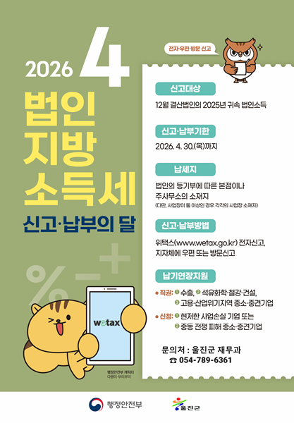 【국제일보】 울진군은 4월 한 달간 법인지방소득세 집중신고·납부기간을 운영한다.