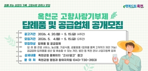 옥천군은 20일부터 한 달간 고향사랑기부제 답례품 및 공급업체를 추가 모집한다고 밝혔다.
