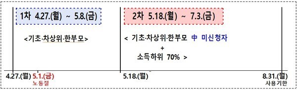 군은 신속한 지원을 위해 기초생활수급자 및 차상위계층을 대상으로 4월 27일부터 5월 8일까지 1차 우선 지급을 실시하고, 이후 5월 18일부터 7월 3일까지 일반대상자 및 1차 미신청자 대상으로 2차 지급을 진행할 계획이다.
