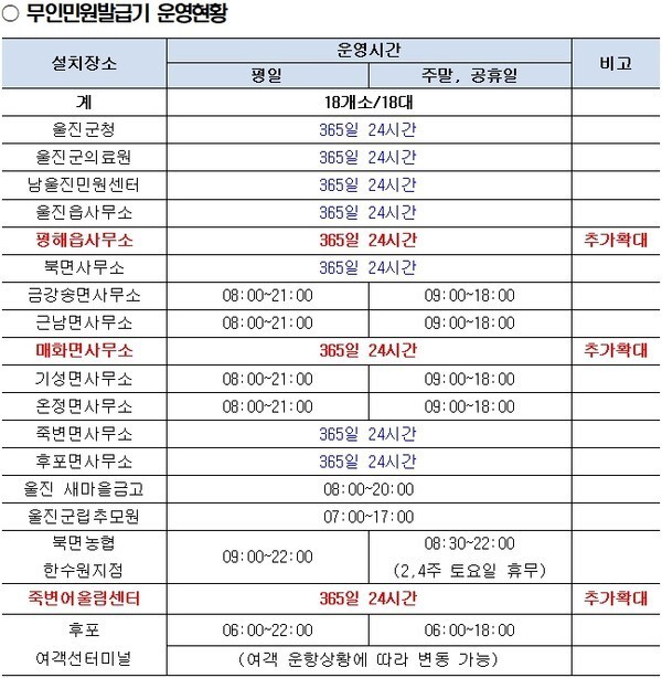 울진군 관계자는 “무인민원발급기의 24시간 확대 운영으로 군민 편의가 크게 향상될 것으로 기대한다”며 “앞으로도 주민 수요에 맞춘 행정서비스 제공에 최선을 다하겠다”라고 말했다.
