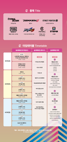 경기 종목은 9월 개최 예정인 ‘2026 아이치·나고야 아시안게임’ 메달 종목인 대전격투 3종(스트리트 파이터 6, 철권 8, 더 킹 오브 파이터즈 XV), 이풋볼 시리즈(PC·모바일), 배틀그라운드 모바일과 국산 게임 <이터널 리턴> 등 6종이 정식 종목으로 선정됐다. 여기에 국산 케이팝 댄스 인공지능(AI) 플랫폼 <스테핀(Stepin)>을 시범종목으로 추가해 총 7개 종목에서 경기가 진행된다. <이터널 리턴>은 이번 대회에서 처음 정식 종목으로 채택됐다.
