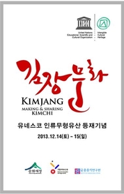 12월14~15일 / 국립무형유산원 문화재청 국립무형유산원(원장 이길배)은 김장문화의 유네스코 인류무형유산 대표목록 등재를 기념하고 생활 속 김장문화의 의미를 되새기기 위해 ‘김장문화 시연과 체험 행사’를 오는 14일과 15일 국립무형유산원 얼쑤마루(대공연장) 로비에서 개최한다. 첫째 날은 오전 11시부터 조선왕조궁중음식 기능보유자 한복려 선생이 김치 담그기를 시연하고, ‘한 문화재 한 지킴이’ 임직원과 전주시 다문화가족, 가족단위 신청자가 함께 김장문화를 체험한다. 특히 이날 행사에는 문화재청 박영대 차장과 송하진 전주시장도 일반 참가자와 함께 체험에 참여하여 분위기를 돋울 예정이다. 둘째 날 오전 11시에는 이북음식 전문가 이현숙 선생의 북부김치 시연, 전주음식명인 김년임 선생의 전라도김치 시연과 더불어 참가자 체험 행사가 진행된다. 체험장 한편에는 한국의 인류무형유산 대표목록, 옛 문헌 속의 김장문화 등 전시와 영상 상영을 통해 김장문화의 인류무형유산 등재 의의를 되새겨 볼 수 있게 하였다. 또 우리나라의 김치 종류와 지역별 김장김치에 대한 이해를 돕기 위해 통배추김치 5품(궁중‧북부‧중부‧경상‧전라)과, 무동