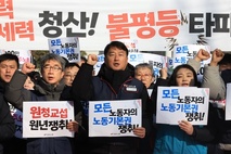 (서울=연합뉴스) 전국민주노동조합총연맹(민주노총)은 7일 노란봉투법(노동조합 및 노동관계 조정법 2·3조 개정안) 시행을 앞두고 고용노동부가 마련한 시행령 개정안을 폐기할 것을 요구했다. 민주노총은 7일 오전 서울 종로구 청와대 앞에서 신년 기자회견을 열어 "올해를 원청교섭의 원년으로 삼겠다"며 "진짜 사장이 책임지는 원청교섭 구조를 반드시 쟁취하겠다"고 밝혔다. 민주노총은 노동부가 입법예고한 노동조합법 시행령 일부 개정안을 폐기해야 한다고 주장했다. 현행 노동조합법에는 교섭 창구 단일화 절차가 규정돼 있는데 노동부는 이번 시행령 개정안을 통해 교섭 창구의 분리·통합과 관련된 결정 기준과 절차를 구체화했다. 민주노총은 별도의 의견서에서 "(입법예고된) 시행령은 이중의 교섭 창구 단일화 절차를 설정해 교섭 성사에 이르는 과정에서 행정적, 법적 다툼을 예고하고 있다"며 "복잡한 교섭구조와 절차를 설계한 것은 원청사용자의 교섭비용을 줄여주겠다는 의도"라고 비판했다. 민주노총은 산하 1천365개 사업장의 노조 대표자들이 서명한 이 의견서를 청와대에 전달했다. 양경수 민주노총 위원장은 "(노동자들의) 투쟁의 결과물로 이제 하청 노동자들이 원청과 교섭할 수 있는 근거를