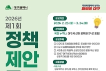 【국제일보】 대구시는 전 국민과 시 산하 공무원의 창의적인 정책 아이디어를 발굴해 시정 발전의 동력으로 활용하고자 '2026년 제1회 정책제안 공모'를 개최한다고 밝혔다. 이번 공모는 총 4개 분야를 주제로 진행된다. ▲대구 대표 지방정원(하중도) 조성을 위한 아이디어 ▲ 대구시 승용차요일제 참여율 제고 방안 ▲시민 중심의 자발적 소방안전관리 문화 확산 방안 ▲2027 대구세계사격선수권대회의 성공 개최 방안이다. 공모 기간은 2월 23일부터 3월 24일까지 30일간이며, 대한민국 국민이라면 누구나 참여할 수 있다. 제안은 대구시 온라인 참여 플랫폼 '토크대구', 국민신문고, 우편, 방문, 팩스 등을 통해 접수 가능하며, 자세한 사항은 대구시청 홈페이지 공고 게시판에서 확인하면 된다. 접수된 제안은 업무 담당부서에서 창의성과 실시 가능성 등을 기준으로 채택 여부를 사전 검토하고, 이후 제안실무위원회 심의를 거쳐 우수 제안 후보를 선정한다. 선정된 후보에 대해서는 5월 초 시민이 직접 참여하는 온라인 투표 점수(30%)와 전문가로 구성된 제안심사위원회 심사 점수(70%)를 합산해 창안 등급과 부상 금액을 결정할 계획이다. 최종 선정 결과는 6월 중 대구시 홈페이