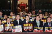 (서울=연합뉴스) 국민의힘 장동혁 대표는 15일 여당을 향해 통일교의 정치권 로비 의혹, 공천헌금 의혹 등 이른바 '쌍특검법' 수용을 촉구하며 단식 농성에 돌입했다. 장 대표는 이날 본회의에 앞서 국회 로텐더홀에서 국민의힘 의원들과 함께 규탄대회를 열고 "국민의 목소리가 모이는 이곳 국회 본회의장 로텐더홀에서 특검법 수용을 촉구하는 단식을 시작한다"고 밝혔다. 그는 "(더불어민주당 김병기 의원의) 블랙폰을 열면 민주당 정청래 대표부터 청와대에 계신 분까지 이런저런 비리가 줄줄이 나올 것이고, 전재수 전 해양수산부 장관 특검을 하면 통일교에서 돈 받은 정치인이 줄줄이 나올 것"이라며 "(민주당은) 정권이 끝장날 것을 알고 쫄아서(겁나서) 못 받는 것"이라고 주장했다. 이어 "진실은 덮는다고 사라지지 않는다"며 "민주당의 패악질을 제대로 알리고 국민과 함께 힘을 모아 싸워야 한다"고 강조했다. 그러면서 "동트기 전 새벽이 가장 어둡다고 했다. 지금이 바로 그때"라며 "국민의힘은 통일교 게이트 특검과 공천뇌물 특검을 통과시키기 위해 개혁신당과 함께 싸울 것"이라고 말했다. 이날 국민의힘 의원들은 로텐더홀에서 '무제한 특검, 통제 없는 폭력' 등이 적힌 손팻말을 들
