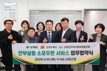 【국제일보】 산청군은 지난 10일 부군수실에서 산청우체국, 산청군지역사회보장협의체와 '안부살핌 소포우편 서비스' 추진을 위한 업무 협약을 체결했다고 밝혔다. 이번 사업은 행정안전부 공모사업인 '2026년 읍면동 스마트 복지·안전서비스 개선 모델 개발 지원사업'에 선정되어 국비 1천만 원, 우체국공익재단 7백만 원 등 총 1700만 원의 예산을 확보해 추진한다. 협약에 따라 산청군은 대상 가구 선정과 안부 물품 제공 및 복지 지원을 수행하며, 산청우체국은 집배원 네트워크를 활용해 물품 배달과 대상자의 안부 확인 결과를 회신한다. 산청군지역사회보장협의체는 사업 추진에 필요한 물품 관련 비용을 지원하며 힘을 보탤 계획이다. 특히, 집배원이 방문 시 체크리스트를 통해 위기 상황을 점검해 군에 보고하면, 읍면 복지 담당 공무원이 즉시 맞춤형 복지 서비스를 연계하게 된다. 군은 지난 2025년에도 사업을 통해 110명에게 총 1320회의 안부 확인 서비스를 제공해 높은 만족도와 고독사 예방 효과를 거두었다. 산청군 관계자는 "우체국, 지역사회보장협의체와의 유기적인 협력을 통해 위기가구를 조기에 발굴하겠다"며 "민관이 함께하는 복지 안전망을 지속적으로 강화해 더욱 따뜻하