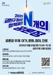 【국제일보】 서울 금천구(구청장 유성훈)는 25일 오후 금천구청사 12층 대강당에서 2025 금천구 청소년 정책토론회 'N개의 공론장'을 개최한다고 밝혔다. 이번 공론장은 금천구 청소년들이 지역사회 구성원으로서 느끼는 문제의식과 아이디어를 공유하는 자리다. 특히 올해는 2025 금천구 청소년 활동 요구 조사 결과를 기반으로 ▲여가 ▲문화 ▲참여와 자치 ▲꿈과 진로 등 4가지 주제를 논의하기로 했다. 관련 정책에 대해 그룹별로 집중토론을 해나갈 예정이다. 이번 공론장은 금천구 관내 각 학교를 대표하는 학생회 청소년과 금천구 청소년시설 내 대표학생 모임 '금천유니브'가 함께한다. 지역 청소년의 일원으로 주제별 문제에 대해 논의하며 해결책을 모색할 예정이다. 정책 당사자로서 목소리를 더하며, 금천구 청소년 정책의 방향을 함께 만들어가려는 시도다. 물론 청소년 정책에 관심 있는 관내 중·고등학생 누구나 참여할 수 있다. 2025 금천구 청소년 정책토론회 'N개의 공론장'에 참여하는 방법은 포스터 속 정보무늬(QR코드) 및 신청링크(https://forms.gle/f917ZpETsY1zU1Q89)를 통해 신청하면 된다. 아울러 금천구는 공론장이 끝난 후 제안된 의견들
