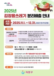 【국제일보】 마포구(구청장 박강수)는 본격적인 김장철을 맞아 오는 11월 1일부터 12월 31일까지 한시적으로 '김장용 쓰레기 특별 수거 기간'을 운영한다고 밝혔다. 본래 김장 쓰레기는 음식물 쓰레기 종량제 봉투에 담아 배출하는 것이 원칙이나, 구는 김장철마다 대량으로 발생하는 배추·무 등 채소류 쓰레기를 효율적으로 처리하고 주민 불편을 최소화하기 위해 한시적으로 일반 종량제봉투 배출을 허용했다. 구민들은 해당 기간 동안 배추, 쪽파 등 '마른 채소류 쓰레기'를 일반종량제 봉투(10ℓ 이상 50ℓ 이하)에 담아 배출할 수 있으며, 봉투 앞면에는 반드시 '김장철 쓰레기'라고 표기해야 한다. 다만, 배출량이 5ℓ 이하인 경우에는 기존과 동일하게 음식물 쓰레기 종량제봉투에 담아 배출하면 된다. 또한 쪽파·대파의 뿌리, 고춧대, 채소 껍질 등은 일반 쓰레기로 따로 배출해야 하며, 절이거나 양념이 된 채소류는 음식물 쓰레기 봉투로 배출해야 한다. 만약 일반 쓰레기와 김장 쓰레기를 혼합해 배출할 경우 미수거 및 과태료 부과 대상이 된다. 배출은 일요일부터 목요일까지(금·토 제외) 오후 6시부터 자정까지 가능하며, 내 집 또는 점포 앞, 건물 옆 공간에 배출하면 된다.