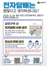 서울 강북구(구청장 이순희)는 오는 24일부터 시행되는 담배사업법 개정에 따라 금연구역 내 전자담배 사용이 전면 금지된다고 밝혔다. 개정 법령에 따르면 학교, 병원, 관공서 등 공공시설은 물론 실외 금연구역에서도 액상형·궐련형 등 모든 전자담배 사용이 제한된다. 전자담배 역시 일반 담배와 동일하게 금연구역에서 사용할 수 없으며, 적발될 경우 10만원 이하의 과태료가 부과된다. 구는 이번 법 개정 사항을 구민들에게 알리기 위해 다양한 홍보를 병행한다. 홍보물에는 '전자담배도 금연 대상'임을 알리는 안내와 함께 관련 정보를 확인할 수 있는 큐알(QR)코드가 포함되며, 금연 지원 서비스로 연계되는 온라인 예약 큐알(QR)코드도 함께 표시된다. 아울러 구는 청소년 보호를 위한 안내도 강화하고 있다. 담배사업법 및 청소년보호법에 따라 청소년을 대상으로 한 전자담배의 판매·대여·배포 행위가 금지된다는 점을 알리고, 전자담배에 대한 잘못된 인식을 바로잡아 청소년 흡연 예방에 대한 경각심을 높인다는 방침이다. 금연을 희망하는 구민을 위해 금연클리닉 운영도 확대한다. 기존 보건소, 수유보건지소에 더해 삼각산보건지소에서도 매주 수요일 오전 9시부터 12시까지 금연클리닉을 추가