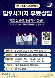 【국제일보】 양천구(구청장 이기재)가 심리적·정서적 어려움을 겪고 있는 청소년의 건강한 성장을 돕기 위해 마음건강 지원 강화에 나섰다. 올해부터 청소년상담복지센터 개인상담 서비스를 전면 무료화하고, 평일 밤 9시까지 연장 운영에 돌입한다고 밝혔다. 구는 지난해 7월부터 12월까지 6개월간 시범운영을 통해 청소년 상담인원이 30% 증가하는 긍정적인 효과를 확인하고, 올해부터 정식운영에 들어간다고 밝혔다. 일상적인 고민 상담부터 위기 상황 상담까지 도움이 필요한 청소년에게 더욱 신속하고 편리하게 상담 기회를 제공한다는 계획이다. 개인상담 시 1회당 5천 원의 비용을 부과하던 기존 제도를 폐지하고, 양천구 거주 청소년을 대상으로 개인상담을 전면 무료로 운영한다. 경제적 부담으로 상담을 망설이던 청소년도 이제는 부담 없이 이용할 수 있게 됐다. 또 평일 상담 종료 시간을 기존 오후 8시에서 오후 9시까지 연장하고, 토요일 상담(오전 9시부터 오후 6시까지)도 함께 운영해 학교와 학원 일정 등으로 낮 시간 상담이 어려운 청소년의 이용 편의를 높일 계획이다. 상담 수요 증가에 대비해 인력과 공간 등 운영체계도 대폭 개선한다. 선호 시간대와 요일별 수요를 분석해 상담인원
